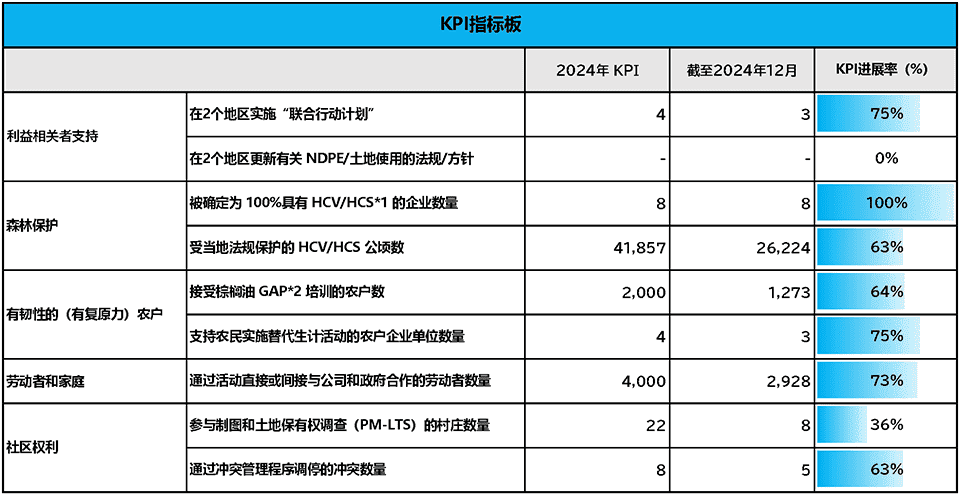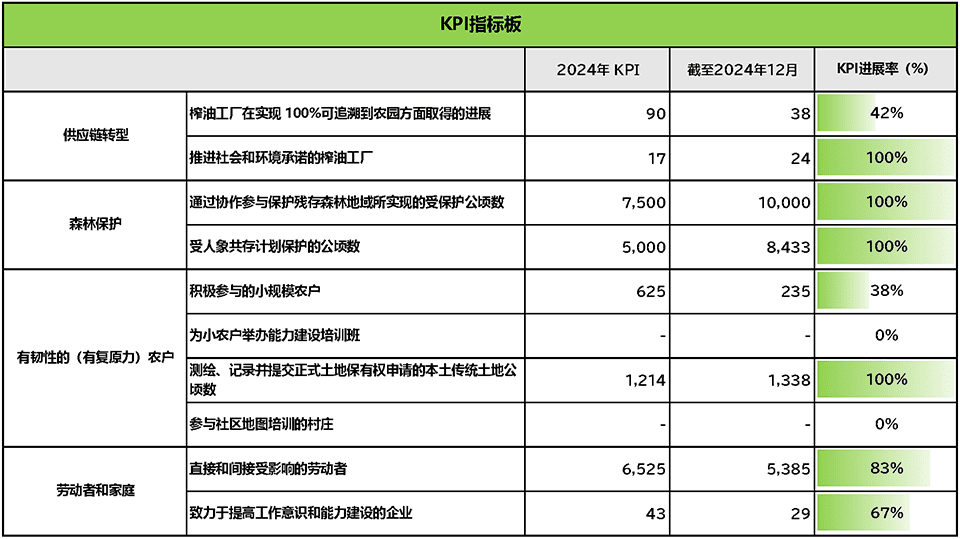 此外,我们参考问责制框架倡议(AFi)以及全球消费品行业组织The Consumer Goods Forum(CGF)制定的森林积极指南(Forest Positive Guidance),制定了棕榈油供应链中实现“至2025年为止,零森林破坏与无土地转换利用目标”。