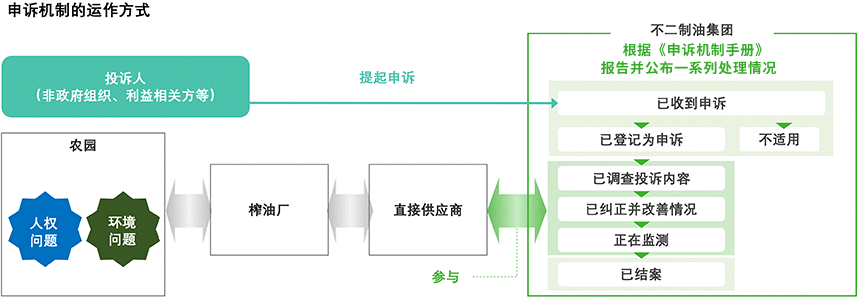 为了提高《负责任的棕榈油采购方针》的透明性和有效性,我们于2018年5月设置了申诉机制*。
