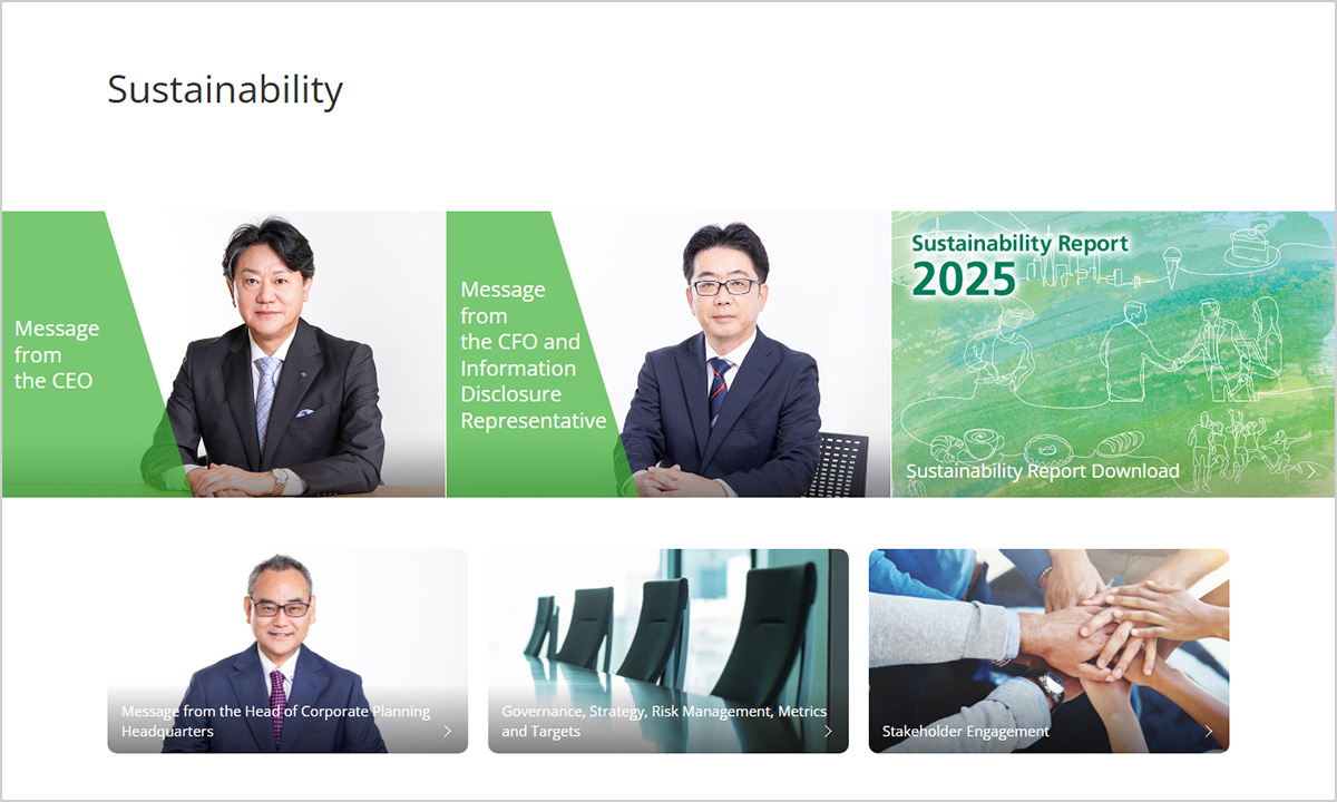 | Sustainability Management | Top Messages: CEO, CFO (also in charge of information disclosure), Executive Officer, General Manager of Corporate Planning Division. Governance: Sustainability management promotion system. Strategy and Risk Management: Risks and opportunities in the value chain. Metrics and Targets: ESG materiality for FY2025. Stakeholder Engagement. |