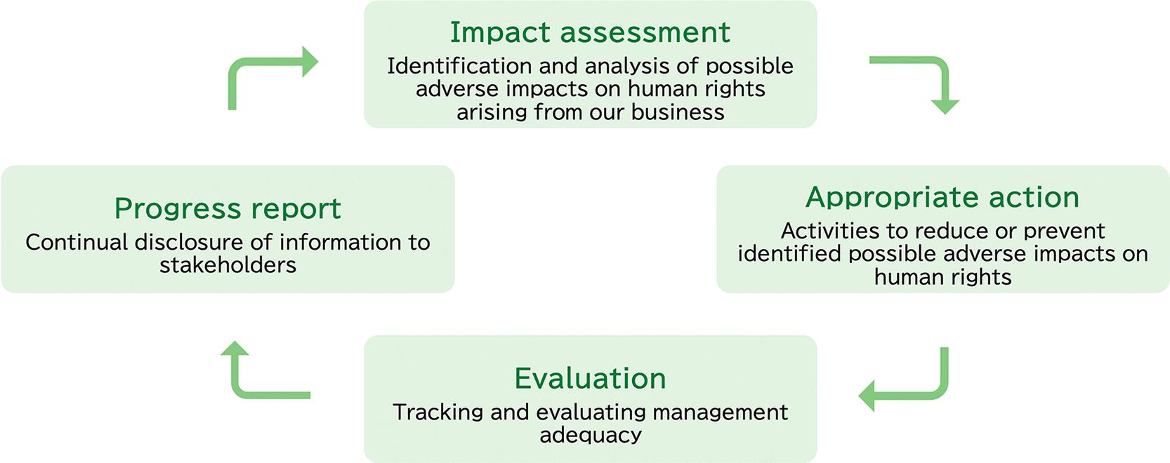 Our Group conducts human rights impact assessments following the process advocated by the UN Guiding Principles on Business and Human Rights with guidance from outside experts in order to identify and evaluate the possible adverse impacts of our business activities on human rights and to identify priority issues.