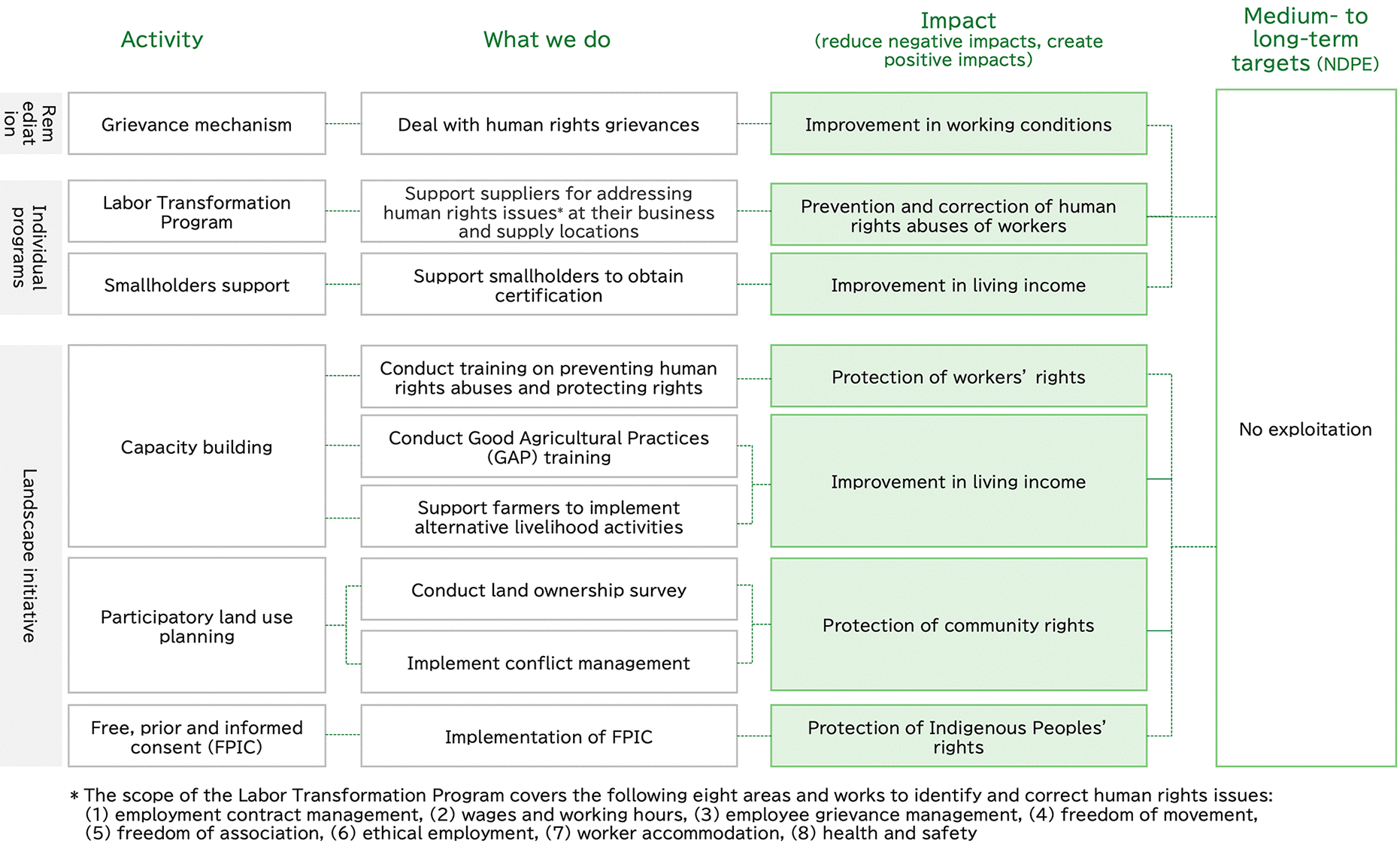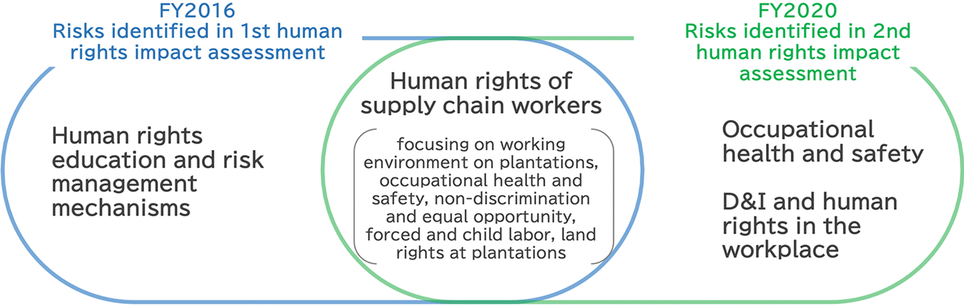 Since our first human rights impact assessment in FY2016, we have been working to understand expectations for the Group and gather input from stakeholders through ongoing dialogues that include experts in the field of business and human rights, industry groups, and NGOs active in regions where our key raw materials are produced. We have also been working to address the human rights issues we identified through initiatives to reduce negative impacts and create positive impacts.