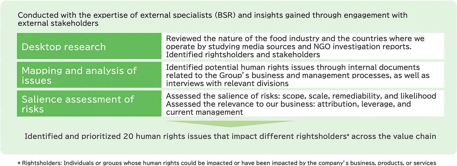 | Second stage | Conducted interviews with internal stakeholders in collaboration with BSR to incorporate as much information from our actual operations as possible. Identified six categories where our business activities may impact human rights: 1) Occupational health and safety, 2) Human rights of supply chain workers, 3) Diversity and inclusion (D&I) and human rights in the workplace, 4) Food safety, 5) Governance, risk, and compliance, and 6) Climate impact on human rights |