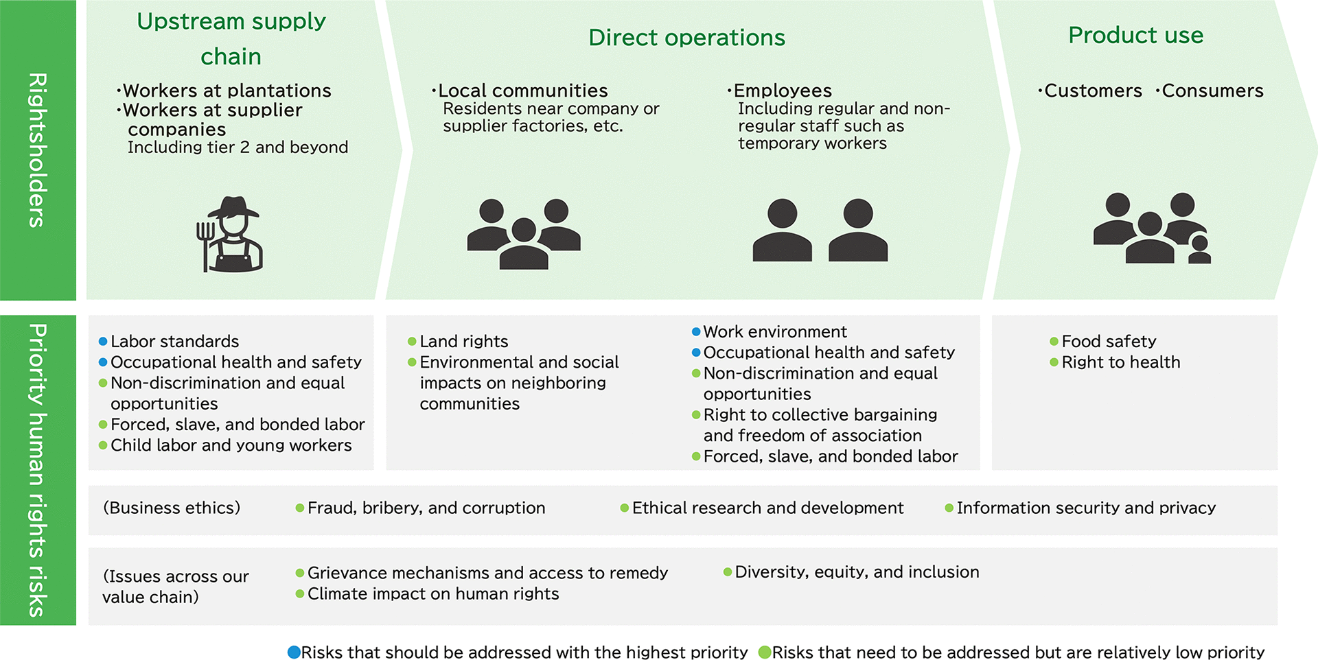 In FY2024, along with our regular human rights impact assessment, we conducted a gap analysis of our human rights due diligence practices against the UN Guiding Principles on Business and Human Rights and current initiatives in the food industry. The results, in particular, highlighted the need to strengthen our human rights governance and implement more robust due diligence initiatives in areas and issues identified as high risk.