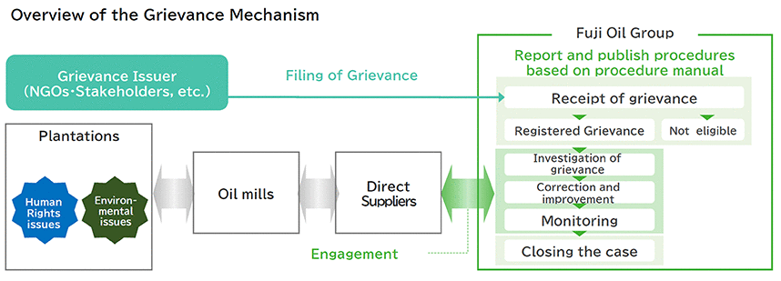 In FY2025, we will consult with industry stakeholders and experts, and plan to make updates to further enhance its effectiveness. The grievance mechanism allows any stakeholder to raise concerns ― through the Fuji Oil Group Grievance Mechanism webpage (in English) ― regarding environmental, human rights, or other issues related to the Fuji Oil Group and our supply chain, without fear of retaliation or negative consequences.