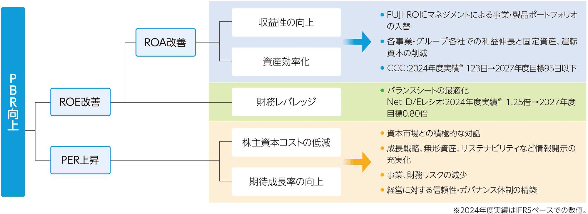 新中期経営計画では、資本効率の改善を最重要課題の一つとして位置づけ、次の3つの重点施策を推進していきます。(1)製品ポートフォリオの見直しと在庫回転率の向上により、運転資本の圧縮を図り、キャッシュ・フローの改善を目指します。(2)各事業本部およびグループ会社においてFUJI ROIC改善に向けた取り組みを強化し、資本効率の向上を図ります。これらの取り組みにより、2024年度末に123日(IFRSベース)であったCCCを、2027年度には95日以下まで短縮を目指します。(3)新体制始動に伴い2025年度に再編した投資管理レビュー制度により、資本コストを基準とした投資・撤退の判断を徹底し、課題の早期発見と解決を実現します。