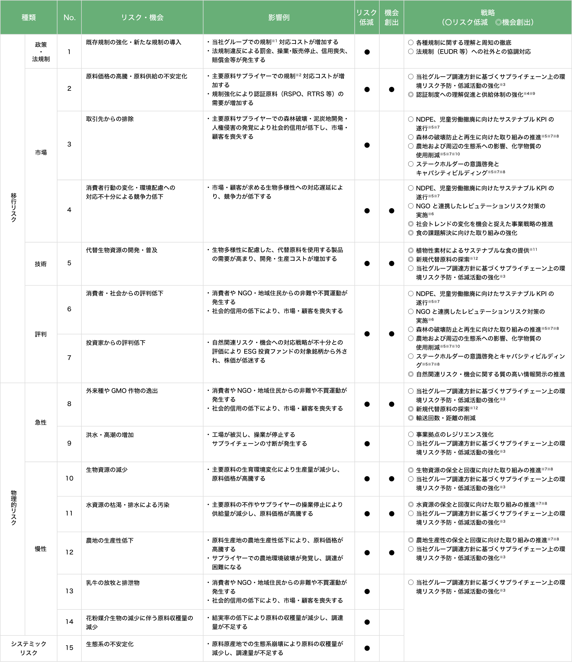 | 気候変動リスク・機会および財務インパクトの影響度評価については、後掲の「不二製油グループにおける気候変動リスク・機会および財務インパクトの影響度評価」をご参照ください。 | 2022年度に実施した全事業にわたる自然および生物多様性課題の重要度をもとに、想定される自然関連リスク※1・機会※2を洗い出しました。さらに2023年度のパーム油およびカカオ調達国でのロケーション分析による依存とインパクト評価結果に基づき、自然関連リスク※1と機会※2を特定し、その対応策をまとめました。 後掲の「不二製油グループのバリューチェーン上の自然関連リスク・機会」をご参照ください。